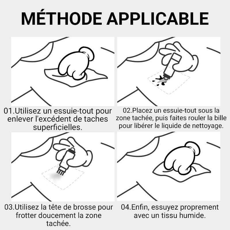 🧻 Fase 1: Tamponare la macchia in eccesso con un tovagliolo di carta. 🎯 Fase 2: Far rotolare la pallina distribuita uniformemente sulla macchia per rilasciare la soluzione detergente. 🖌️ Fase 3: Strofinare delicatamente con la testina curva. 💦 Fase 4: Pulire con un panno umido: la macchia è sparita!