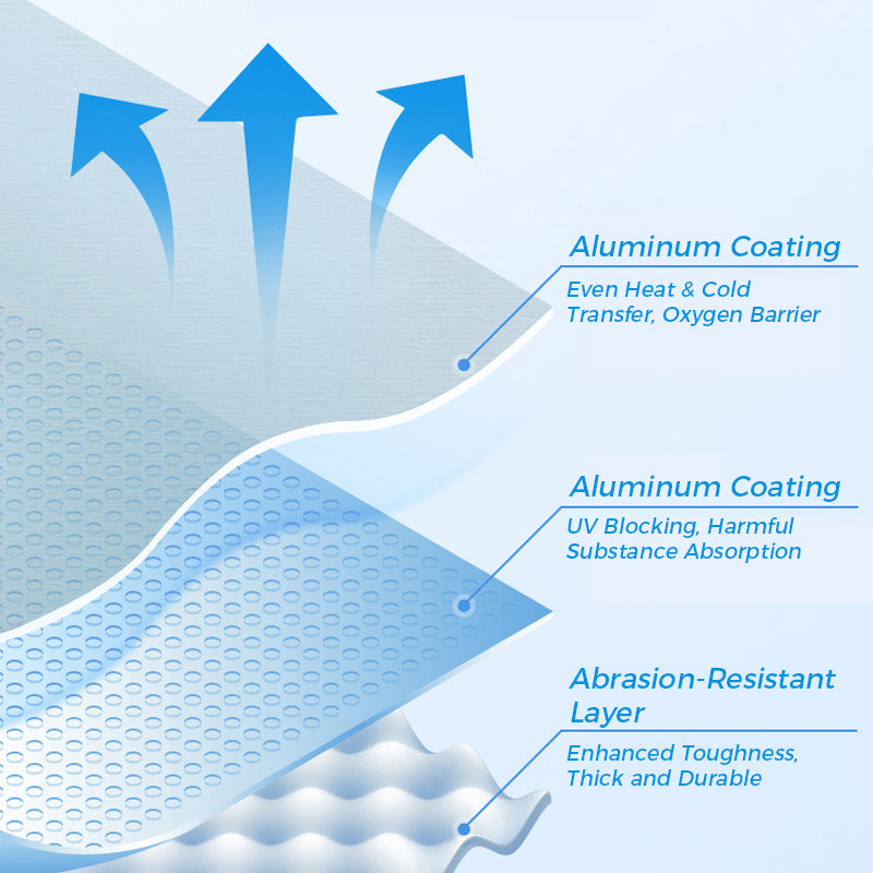 STRUTTURA COMPOSITA MULTISTRATO - Combina PE, foglio di alluminio e PET per creare una barriera robusta. Questa struttura blocca efficacemente i contaminanti esterni, preserva i nutrienti e previene le bruciature da congelamento, garantendo una qualità e una sicurezza ottimali degli alimenti.